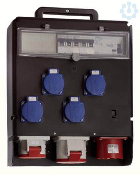 mit: 1 CEE-Gerätestecker 32A 1 CEE-Steckdose 32A + 1x -16A 1 CEE-Gerätestecker 32A 4 Schukosteckdosen 250V 1 FI-Schalter 40A, 30mA IP X4
