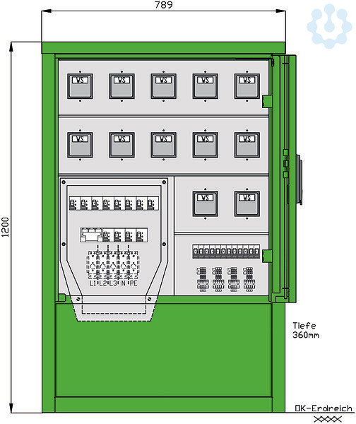 Gehäuse aus Edelstahl (Werkstoff 1.4301) mit Lackierung RAL 6017 -maigrün- mit Bodenflanschplatte und innenliegenden Bohrungen zur Befestigung mit Einfachtür und 3-Punkt-Stangenschloss sowie Schwenkhebel mit Profilhalbzylinder, Schließung G2123 sowie Kunststoff-Regenschutzkappe Einbauten bis einschl. RCD-Schutzschalter schutzisoliert vordere Blende zur Montage abnehmbar Kabelausführung bei geschlossener Tür möglich Schutzart: IP 44 Größe ca.: 1200 x 785 x 360mm / H-B-T