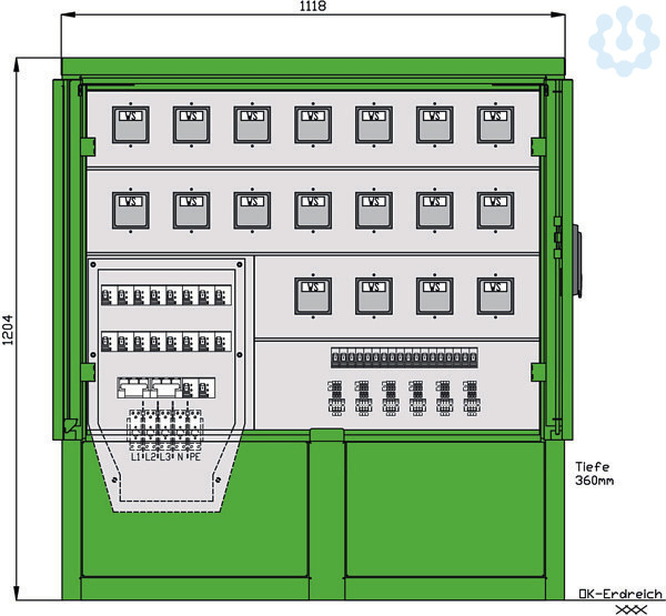 Gehäuse aus Edelstahl (Werkstoff 1.4301) mit Lackierung RAL 6017 -maigrün- mit Bodenflanschplatte und innenliegenden Bohrungen zur Befestigung mit Doppeltür und 3-Punkt-Stangenschloss sowie Schwenkhebel mit Profilhalbzylinder, Schließung G2123 sowie Kunststoff-Regenschutzkappe Einbauten bis einschl. RCD-Schutzschalter schutzisoliert vordere Blende zur Montage abnehmbar Kabelausführung bei geschlossener Tür möglich Schutzart: IP 44 Größe ca.: 1200 x 1100 x 360mm / H-B-T