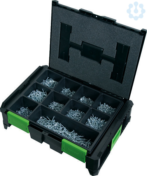 SysCon BlechschraubenInhalt: 2000 Universalschrauben1 ? 220370 ? ABS-Kunststoffbox ?SysCon S? 1 ? 220375 ? Sortimentseinlage ?SysCon? 1 ? 220399 ? Schaumeinlage ?SysCon? 400 x 300 x 10 mm ? Menge ? Art. Nr. ? Bezeichnung ? Antr.? Größe. ? 200 ? 790327 ? Universalschraube Linsenkopf ? PH2 ? 4,2 x 19 ? 200 ? 790329 ? Universalschraube Linsenkopf ? PH2 ? 4,2 x 25 ? 200 ? 790332 ? Universalschraube Linsenkopf ? PH2 ? 4,2 x 31 ? 200 ? 790333 ? Universalschraube Linsenkopf ? PH2 ? 4,2 x 38 ? 200 ? 790450 ? Montageschraube mit Scheibe ? PH2 ? 4,2 x 13 ? 200 ? 790452 ? Montageschraube mit Scheibe ? PH2 ? 4,2 x 25 ? 200 ? 790456 ? Montageschraube mit Scheibe ? PH2 ? 4,2 x 45 ? 200 ? 790470 ? Montageschraube mit Scheibe selbsts. ? PH2 ? 4,2 x 13 ? 200 ? 790423 ? Blechschraube DIN 7504M ? PH2 ? 24,2 x 16 ? 200 ? 790426 ? Blechschraube DIN 7504M ? PH2 ? 4,2 x 25