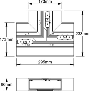 Gerätekanal-T-Stück 90°, einzügig, symmetrisch, mit zwei durchgehenden Aufnahmeprofilen im Rückenteil sowie durchlaufender Perforation im Kanalrücken, einschließlich drei Kanalkupplungen KUV, Stoßstellenverbinder BSV65/170 zur exakten Verbindung mit dem Kanalunterteil bitte gesondert bestellen. VDE zertifiziert! Abmessungen (ca. Maße) H x T : 173 x 66 mm Haupt- und Abgangsquerschnitt Deckelöffnung : 80 mm Länge in Hauptrichtung : 295 mm Länge in Abgangsrichtung : 233 mm für Gerätekanalunterteil : BU651708... Werkstoff : PVC-hart (Polyvinylchlorid) Farbton : reinweiß RAL : 9010 (ähnlich)
