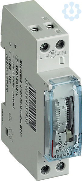 Legrand MicroRex QT11, analoge Tageszeitschaltuhr mit Quarzmotor (Ganggenauigkeit +/- 2,5 Sek/Tag, Gangreserve 100 Std.), für Verteilereinbau, 1 Kanal, Betriebsspannung 230 V 50/60 Hz, mit Handschalter: EIN-Automatik-AUS, mit unverlierbaren Schaltsegmenten, Deckel plombierbar, kürzeste Schaltzeit: 15 Min.. Schaltausgang: 1 Schließer.