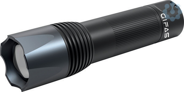 Gehaeuse aus Flugzeugaluminium, gehaerteter Leuchtenkopf als Nothammer, zum Einschlagen einfacher Scheiben,Linse aus Kunststoff, optischer Fokus fuer maximale Flexibilitaet, vegoldete Kontakte, Schalter im Griffstueck (Bodenplatte)