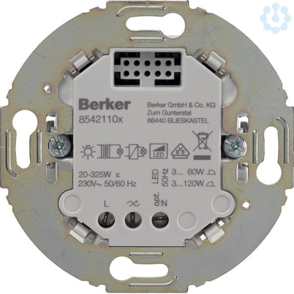 Tastdimmer 1fach (R, L) 2-Draht, Tragring rund. Tastdimmer (R, L), Elektronikplattform 2012, niedriger Eigenenergiebedarf, Einschalthelligkeit netzausfallsicher speicherbar, lampenschonender Softanlauf, Phasenanschnitt, kurzschlussfest und überlastsicher (elektronische Sicherung), mit Nebenstelleneingang für Taster (Schließer) mit Einflächenbedienung und Bewegungsmelder Nebenstelle, auch geeignet für das Aufstecken passender KNX Funk Aufsätze, erweiterbar durch Universal-Leistungszusätze Plus REG, keine leitende Verbindung zwischen Tragring und Spreizkrallen, mit Schraubklemmen.