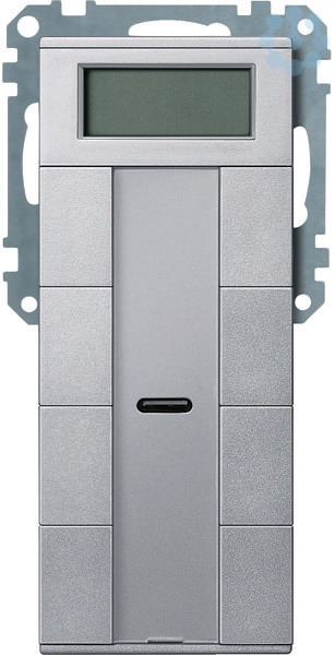 Im Design System M. Komfortable Steuerungseinheit mit 8 Bedientasten, Betriebs-, Statusanzeige und Schriftfeld. Die Betriebsanzeige kann auch als Orientierungslicht verwendet werden. Mit Raumtemperaturregler und Display. Mit integriertem Piezo-Summer zur Anzeige von Alarmzuständen und IR-Empfänger. Mittels IR-Fernbedienung können alle Funktionen der jeweiligen Tasten angesteuert werden. Mit 9 roten LEDs. Der Raumtemperaturregler ist für Heizung und Kühlung mit stufenlos verstellbaren KNX-Stellantrieben oder zur Ansteuerung von Schaltaktoren und Heizungsaktoren verwendbar. Mit weiß hinterleuchtetem Display zur Darstellung von z. B. Uhrzeit, Datum, Temperatur und Betriebsmodus. Menü zur Einstellung von Standard-Betriebsarten, Sollwert, Arbeitstag/arbeitsfreier Tag (externe Ansteuerung), Anzeigemodus, Uhrzeit, Schaltzeiten und Helligkeit des Displays. Die Tasten sind als Tastenpaar (zweiflächig) oder als Einzeltasten frei parametrierbar. Mit integriertem Busankoppler. Der Busanschluss erfolgt über eine Busanschl
