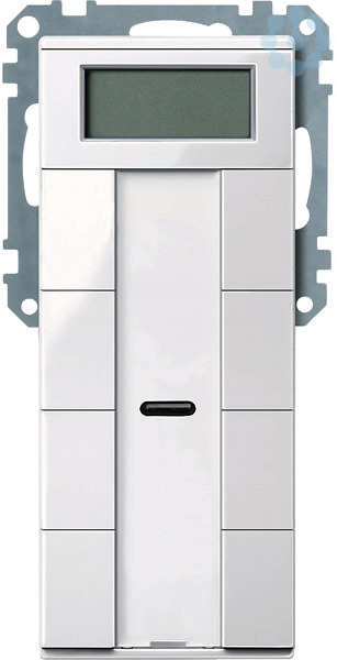 Im Design System M. Komfortable Steuerungseinheit mit 8 Bedientasten, Betriebs-, Statusanzeige und Schriftfeld. Die Betriebsanzeige kann auch als Orientierungslicht verwendet werden. Mit Raumtemperaturregler und Display. Mit integriertem Piezo-Summer zur Anzeige von Alarmzuständen und IR-Empfänger. Mittels IR-Fernbedienung können alle Funktionen der jeweiligen Tasten angesteuert werden. Mit 9 roten LEDs. Der Raumtemperaturregler ist für Heizung und Kühlung mit stufenlos verstellbaren KNX-Stellantrieben oder zur Ansteuerung von Schaltaktoren und Heizungsaktoren verwendbar. Mit weiß hinterleuchtetem Display zur Darstellung von z. B. Uhrzeit, Datum, Temperatur und Betriebsmodus. Menü zur Einstellung von Standard-Betriebsarten, Sollwert, Arbeitstag/arbeitsfreier Tag (externe Ansteuerung), Anzeigemodus, Uhrzeit, Schaltzeiten und Helligkeit des Displays. Die Tasten sind als Tastenpaar (zweiflächig) oder als Einzeltasten frei parametrierbar. Mit integriertem Busankoppler. Der Busanschluss erfolgt über eine Busanschl