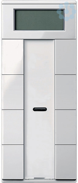 Im Design System M. Komfortable Steuerungseinheit mit 8 Bedientasten, Betriebs-, Statusanzeige und Schriftfeld. Die Betriebsanzeige kann auch als Orientierungslicht verwendet werden. Mit Raumtemperaturregler und Display. Mit integriertem Piezo-Summer zur Anzeige von Alarmzuständen und IR-Empfänger. Mittels IR-Fernbedienung können alle Funktionen der jeweiligen Tasten angesteuert werden. Mit 9 roten LEDs. Der Raumtemperaturregler ist für Heizung und Kühlung mit stufenlos verstellbaren KNX-Stellantrieben oder zur Ansteuerung von Schaltaktoren und Heizungsaktoren verwendbar. Mit weiß hinterleuchtetem Display zur Darstellung von z. B. Uhrzeit, Datum, Temperatur und Betriebsmodus. Menü zur Einstellung von Standard-Betriebsarten, Sollwert, Arbeitstag/arbeitsfreier Tag (externe Ansteuerung), Anzeigemodus, Uhrzeit, Schaltzeiten und Helligkeit des Displays. Die Tasten sind als Tastenpaar (zweiflächig) oder als Einzeltasten frei parametrierbar. Mit integriertem Busankoppler. Der Busanschluss erfolgt über eine Busanschl