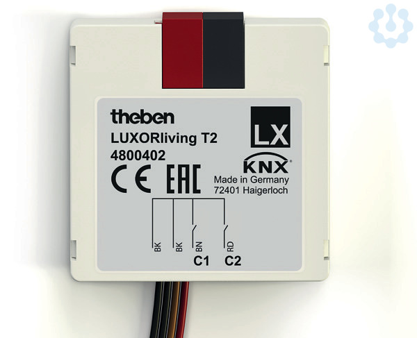 Tasterschnittstelle/Binäreingang für bis zu 2 Kanäle für das Smart Home System LUXORliving, potentialfreie Eingänge, Kabelanschluss 4-polig, einbaubar zusammen mit konventionellen Tastern/Schaltern in Unterputzdosen, Softwarefunktionen: Schalter/Taster, Dimmen, Jalousie, Eingänge/Ausgänge parametrierbar, LED an Ausgang anschließbar