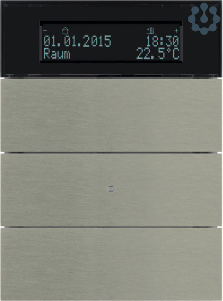 Tastsensor 3fach mit Temperaturregler und Display B.IQ Edelstahl Rostfrei. B.IQ Tastsensor 3-fach mit Temperaturregler und Display (RTR-Display), rahmenlos, drei Wippen, mit Betriebs-LED, blau und sechs Status-LED, weiß, Display, dunkel mit weiß leuchtender Schrift, mit Demontageschutz. Unterputz-Installation. EIB-Anwendermodul zum Aufstecken auf Busankoppler plus Up über Anwenderschnittstelle (AST). Kombinationsgerät aus Tastsensor und Raumtemperaturregler mit Raumtemperaturschaltuhr sowie zwei Wochenschaltuhren, 3 Wippen zur Bedienung von Gebäudefunktionen in beliebigen Kombinationen, zweizeiliges Display mit zusätzlicher Symbolzeile, mit zwei zusätzlichen integrierten Tasten zum Einstellen und Ablesen von Raumtemperatur, Raumtemperaturschaltuhr, Wochenschaltuhren, Grundeinstellungen sowie Anzeige von Datum, Uhrzeit, Außentemperatur sowie 14 Byte Meldetexten (EIS 15). Display: Beleuchtung Ein, automatische Abschaltung, Schaltung über Objekt. Beschriftung möglich über optionale Beschriftungsfelder, Beleuchtu