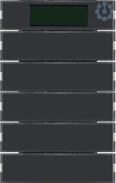 Tastsensor 5fach mit RTR, Display K.1 anthrazit. Tastsensor 5-fach mit Raumtemperaturregler, Display zur Vorortbedienung von Schalt-, Tast-, Dimm-, Jalousie-, Raumtemperaturreglerfunktionen, mit Demontageschutz, mit weißer Betriebs- und zehn roten Status-LED, LC-Display mit Symboldarstellung, Tasten vollflächig beschriftbar, mit 2 zusätzlichen Display-Tasten zur Programmierung über Display, zum Aufstecken auf Busankoppler Up. Applikationseigenschaften: Displaymenüumfang für Bedienung parametrierbar, Anzeige von Betriebsart, Reglersperrung, Raum-, Außentemperatur, Uhrzeit (Zeitgeber erforderlich), Betriebs-LED schaltbar über Objekt Alarmtelegramm nach Abziehen von Busankoppler 1 Bit oder 1 Byte. Tastsensorfunktionen: Schalt-, Tast-, Dimm-, Jalousiefunktionen programmierbar, Funktion 2 Telegramme programmierbar, Wertgeber für Dimm-, Helligkeits- und Temperaturwerte 1 und 2 Byte, Nebenstelle für Lichtszenentastsensor, zyklisches Senden auch über Nebenstelle möglich, Tasten oder Wippen parametrierbar, Einflächenb