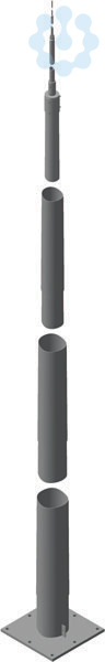 Tele-Blitzschutzmast für Köcher- oder Betonfundament, geprüft nach DIN EN 62561-(1+2). Zum Schutz vor direktem Blitzeinschlag bei besonderen Anlagen wie z. B. Biogas-Anlagen, PV-Anlagen auf Freiflächen, Ex-Anlagen, Munitionslager. Der Mast ist nach Eurocode 1 (DIN EN 1991-1-4 + DIN EN 1991-1-4/NA) für eine max. Böenwindgeschwindigkeit von 166 km/h dimensioniert. Die Maste werden mit Köcherfundament (Fertigteilelement) oder im Betonfundament vor Ort mit Ankerkorb errichtet. Ausführung mit Flanschplatte zur schnellen Montage und konische Mastteile mit Stecksystem, inkl. prüffähiger Statik. Höhe über Flur 22,35 m.