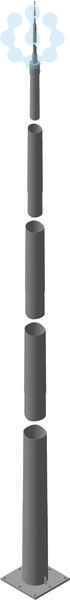Tele-Blitzschutzmast für Köcher- oder Betonfundament, geprüft nach DIN EN 62561-(1+2). Zum Schutz vor direktem Blitzeinschlag bei besonderen Anlagen wie z. B. Biogas-Anlagen, PV-Anlagen auf Freiflächen, Ex-Anlagen, Munitionslager. Der Mast ist nach Eurocode 1 (DIN EN 1991-1-4 + DIN EN 1991-1-4/NA) für eine max. Böenwindgeschwindigkeit von 159 km/h dimensioniert. Die Maste werden mit Köcherfundament (Fertigteilelement) oder im Betonfundament vor Ort mit Ankerkorb errichtet. Ausführung mit Flanschplatte zur schnellen Montage und konische Mastteile mit Stecksystem, inkl. prüffähiger Statik. Höhe über Flur 24,85 m.