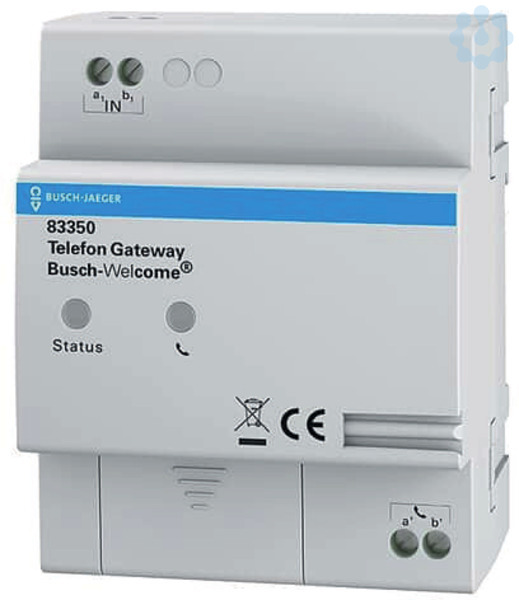 Zum Anschluss einer Busch-Welcome® Anlage an die analogen Eingänge einer vorhandenen Telefonanlage. Ermöglicht die Nutzung eines Telefones (z.B. DECT, ISDN, Mobiltelefon) als Türkommunikations-Innenstation. Rufannahme, Türöffnen, Lichtschalten über die Telefontastatur (DTMF). Umschaltung zwischen frei-programmierbaren Zielrufnummern über die Telefontastatur (DTMF). PIN-Schutz für alle Konfigurationseinstellungen. Für Busch-Welcome® Anlagen mit bis zu 99 Wohneinheiten. Programmierung über die Telefontastatur (DTMF) oder über einen Web-Browser (erfordert IP-Gateway 83342). 2 Schraubklemmen für analogen a/b Anschluss der Telefonanlage. Verbrauchseinheiten: 1 Weitere Informationen zur Inbetriebnahme und Bedienung finden Sie im Systemhandbuch und der Online Bedienungsanleitung im aktuellen Online-Katalog.