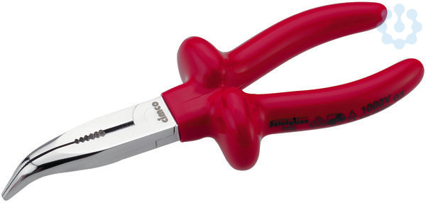 Griffe mit zweifarbiger Kunststoff-Tauchisolation für optimale Sicherheit. Bei Beschädigung der äußeren roten Isolationsschicht signalisiert die nun sichtbare untere orangefarbene Kunststoffisolation, dass nicht mehr eine 100-prozentige Sicherheit gemäß den Sicherheitsnormen gegeben ist. Telefonzange DIN ISO 5745, Länge 160mm, mit eingelegtem Gelenk, gebogene, ovalspitze Backen und Seitenschneider.
