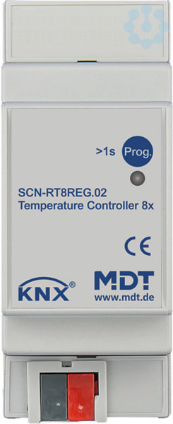 Temperaturregler 8-fach, 2TE, REG. Ausführung im Reiheneinbaugehäuse. Temperaturbereich -20 bis +110°C. Reglertyp (2-Punkt, PI, PWM) auswählbar. Temperaturmessung erfolgt über separate KNX Bussensoren. Grenzwerte Min/Max. Frost-/Hitzealarm. Min/Max Wertespeicher. Zyklisches Senden einstellbar. Tag-/Nacht-/Frost-/Hitzeschutzbetrieb, Kühlfunktion. Statusrückmeldung über HVAC und RHCC Status Objekte. Umschaltung der Betriebsart über Bit/Byte Objekte. Sollwertvorgabe über Visualisierung, z. B. MDT VisuControl. 3 Jahre Produktgarantie.