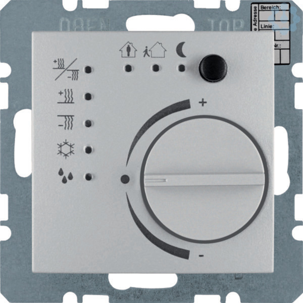 Temperaturregler mit Tasterschnittstelle B.7 alu, matt. Raumtemperaturregler mit Tasterschnittstelle für individuelle Einzelraumregelung, mit Demontageschutz, Betriebsarten: Komfort, Standby, Nachtabsenkung, Frost-/Hitzeschutz, Taupunkt je durch LED angezeigt, mit Status-LED rot heizen, blau kühlen und gelb für aktiviert, mit Präsenztaste für die Umschaltung zwischen Komfort- und Standby-Betrieb, Präsenztaste und Regulierknopf funktionslos parametrierbar. Für stetige oder schaltende Regelung. Für Heiz- und/oder Kühlbetrieb, Heizen oder Kühlen in 2 Stufen möglich, Ventilschutz parametrierbar, Verhalten bei Busspannungswiederkehr parametrierbar, mit Programmiertaste und roter Programmier-LED, mit 4 unabhängigen Binäreingängen für potenzialfreie Kontakte, 4 Binäreingänge oder 2-3 Binäreingänge und 1-2 Ausgänge parametrierbar, mit integriertem Busankoppler, Busanschluss über Anschlussklemme, Binäreingänge/-ausgänge mit Schraubklemmen. Unterputz-Installation, Flächen-/Designprogramm.