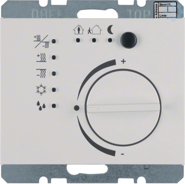 Temperaturregler mit Tasterschnittstelle K.1 polarweiß, glänzend. Raumtemperaturregler mit Tasterschnittstelle für individuelle Einzelraumregelung, mit Demontageschutz, Betriebsarten: Komfort, Standby, Nachtabsenkung, Frost-/Hitzeschutz, Taupunkt je durch LED angezeigt, mit Status-LED rot heizen, blau kühlen und gelb für aktiviert, mit Präsenztaste für die Umschaltung zwischen Komfort- und Standby-Betrieb, Präsenztaste und Regulierknopf funktionslos parametrierbar. Für stetige oder schaltende Regelung. Für Heiz- und/oder Kühlbetrieb, Heizen oder Kühlen in 2 Stufen möglich, Ventilschutz parametrierbar, Verhalten bei Busspannungswiederkehr parametrierbar, mit Programmiertaste und roter Programmier-LED, mit 4 unabhängigen Binäreingängen für potenzialfreie Kontakte, 4 Binäreingänge oder 2-3 Binäreingänge und 1-2 Ausgänge parametrierbar, mit integriertem Busankoppler, Busanschluss über Anschlussklemme, Binäreingänge/-ausgänge mit Schraubklemmen. Unterputz-Installation, Flächen-/Designprogramm.