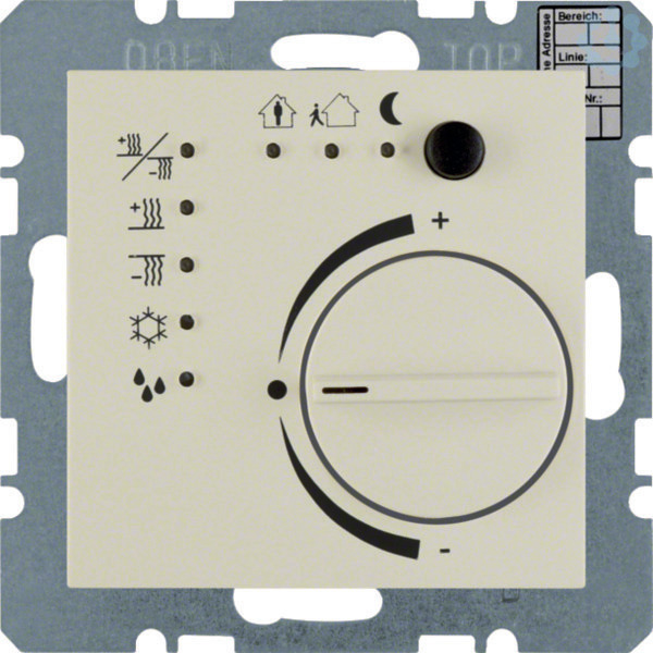 Temperaturregler mit Tasterschnittstelle S.1 weiß, glänzend. Raumtemperaturregler mit Tasterschnittstelle für individuelle Einzelraumregelung, mit Demontageschutz, Betriebsarten: Komfort, Standby, Nachtabsenkung, Frost-/Hitzeschutz, Taupunkt je durch LED angezeigt, mit Status-LED rot heizen, blau kühlen und gelb für aktiviert, mit Präsenztaste für die Umschaltung zwischen Komfort- und Standby-Betrieb, Präsenztaste und Regulierknopf funktionslos parametrierbar. Für stetige oder schaltende Regelung. Für Heiz- und/oder Kühlbetrieb, Heizen oder Kühlen in 2 Stufen möglich, Ventilschutz parametrierbar, Verhalten bei Busspannungswiederkehr parametrierbar, mit Programmiertaste und roter Programmier-LED, mit 4 unabhängigen Binäreingängen für potenzialfreie Kontakte, 4 Binäreingänge oder 2-3 Binäreingänge und 1-2 Ausgänge parametrierbar, mit integriertem Busankoppler, Busanschluss über Anschlussklemme, Binäreingänge/-ausgänge mit Schraubklemmen. Unterputz-Installation, Standardprogramm.