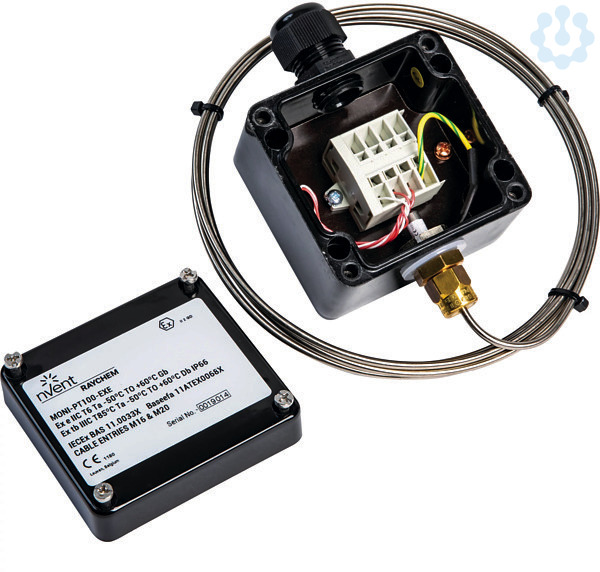 Fühler für Ex-Bereiche, Pt 100-Sensor (3-Leiter-Technik) an vier Federklemmen im glasfaserverstärkten schwarzen Polycarbonat-Anschlusskasten angeschlossen. Eine M20-EEx e-Kabelverschraubung für die Anschlussleitung ist vormontiert.