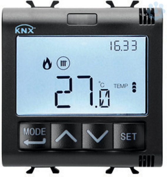 Unterputz- Thermostat mit Feuchtemanagement, zur Steuerung von BUS-Geraeten fuer Heizung/Kuehlung und Befeuchtung/Entfeuchtung und fuer die manuelle Steuerung der Betriebsmodi (Komfort, Standby, Nacht). Fuer 2- und 4-Rohrsysteme: Zwei-Punkt-Regelung (EIN/AUS oder 0%/100%), proportional-integral (PWM oder stetig), Fan-Coil (max. 3 Stufen). Beinhaltet: 1 Ausgang fuer die Steuerung des Magnetventils (oder als allgemeiner Ausgang fuer Schalten, zeitgesteuertes Schalten, Zwangsfuehrung oder Szenen). 1 Eingang fuer potenzialfreie Kontakte (fuer Fensterkontakte, Jalousiesteuerung, Dimmen und Szenen). 1 Eingang fuer den externen NTC Fuehler (z.B. fuer den Schutz der Fußbodenheizung) oder Alternativ als zweiter Eingang fuer potenzialfreie Kontakte. Mit LCD Display und anpassbarer RGB Hinterleuchtung. Inbetriebnahme mit ETS. Kombinierbar mit KNX Unterputz-Chronothermostaten fuer die lokale Temperatureinstellung: In diesem Fall agiert der Thermostat als Slave, der die Temperaturprofile