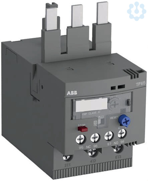 TF65 werden normalerweise an Schütze AF40 bis AF65 angebaut, mit Hilfe eines Einzelaufstellung-Sets können die Geräte aber auch separat auf DIN-Schiene montiert werden. Bei Überschreitung des an der Stromskala eingestellten Motorstromes lösen die Relais über Bimetall-Elemente aus und wechseln damit die Schaltstellung der beiden Hilfskontakte 1S/1Ö. Ein vorgeschaltetes Schütz wird dadurch abgeschaltet. Die Relais erlauben manuelles oder automatisches Rücksetzen, sie verfügen über Test- und Stopp-Funktion sowie eine ausgelöst-Anzeige. Die Stromskala der Geräte ist plombierbar. Zubehör wie Rückstell-Taster und Dahtrücksteller ergänzen das Sortiment.