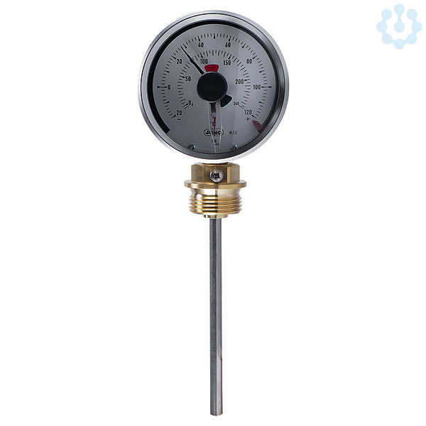 Das Zeigerkontaktthermometer mit einem Edelstahl Gehäuse (Werkstoff 1.4301, Schutzart IP 54) hat einen Gehäusedurchmesser von 80 mm. Das verwendete Messsystem arbeitet nach derm Flüssigkeitsausdehnungsprinzip. Die Temperatur wird durch einen Zeiger auf einer weißen Skala mit schwarzer Beschriftung angezeigt. Das Gerät hat eine Genauigkeitsklasse von 1,5 ähnlich DIN EN 13190. Die Temperatur kann durch eine Acrylglasscheibe (PMMA) in °C oder °F abgelesen werden. Der verbaute Microschalter kann mit Hilfe eines Sollwertstellers in der Frontscheibe auf die gewünschte Abschalttemperatur eingestellt werden. Das Gerät zeichnet sich durch eine hohe Schaltpunktgenauigkeit von +/-0,7 K bezogen auf den eingestellten Abschaltpunkt bei steigender Temperatur aus. Die maximal zulässige Schaltleistung des verbauten Wechselkontakts beträgt 5 Amp. / 230 Volt AC. Der elektrische Anschluss erfolgt über Schraubklemmen und ist durch eine Abdeckkappe geschützt. Die Schaltdifferenz (Hysterese) beträgt ca. 1,5 % des Anzeigebereichs. D