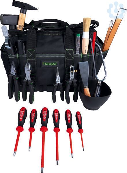 HAUPA ?ToolBag XL Classic?Werkzeugtasche nicht nur für den Auszubildenden, mit Einsteckfächern innen und außen, Bodenschale mit Gummi verstärkt, doppelte Kreuznaht für hohe Belastung, abnehmbarer Schultergurt, verstellbar, 10 Einsteckfächer außen (verschiedene Größen), 10 Einsteckfächer innen (verschiedene Größen), Gurte für Wasserwaage (außen), Material: extra starkes 600D Polyester, wasserdicht und schmutzabweisend, Farbe: grün, schwarz. Tasche 220366.Inhalt: ? 2K-VDE Elektriker-Schraubendreher 2,5 x 75, 4 x 100, 5,5 x 125, 6,5 x 150 mm ? 2K-VDE Kreuzschlitzschraubendreher PH, Gr. 1 + 2 ? 2K-Kombinationszange 200 mm ? 2K-Kraftseitenschneider 175 mm ? 2K-Storchschnabelzange gerade ? 2K-Abisolierzange 160 mm ? Spannungsprüfer ? Abmantler mit Hakenklinge, 8 ? 28 mm Ø ? Wasserpinsel ? Malerspachtel 40 mm ? Steinmeißel 300 mm ? Elektrikermeißel 10 x 250 mm ? Schlosserhammer 300 g ? Fäustel 1000 g ? Gipsmulde ? Kabelmesser, 1-teilig ? PUK-Säge mit festem Griff ? Zimmermannsbleistift