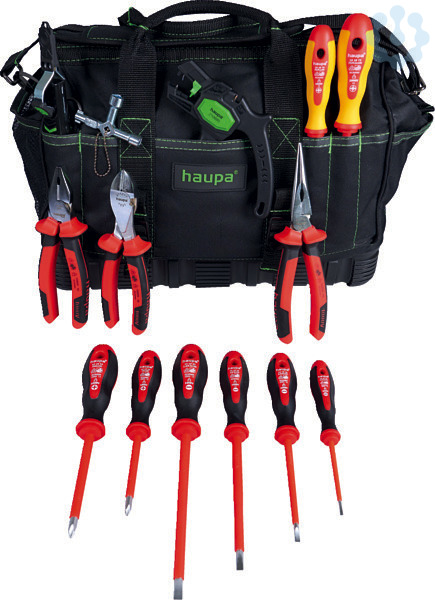 HAUPA ?ToolBag XL Go?Werkzeugtasche nicht nur für den Auszubildenden, mit Einsteckfächern innen und außen, Bodenschale mit Gummi verstärkt, doppelte Kreuznaht für hohe Belastung, abnehmbarer Schultergurt, verstellbar, 10 Einsteckfächer außen (verschiedene Größen), 10 Einsteckfächer innen (verschiedene Größen), Gurte für Wasserwaage (außen), Material: extra starkes 600D Polyester, wasserdicht und schmutzabweisend, Farbe: grün, schwarz. Tasche 220366.Inhalt: ? VDE-Kombizange 185 mm ? VDE-Kraftseitenschneider 170 m ? VDE-Storchschnabelzange gerade 200 mm ? 2K-VDE-Schraubendreher PZ/FL 1 + 2 ? 2K-VDE-Elektriker-Schraubendreher 2,5x75, 3,5x100, 4x100, 6,5x150 mm ? 2K-VDE-Schraubendreher PH 1 + 2 ? Abisolierzange 0,2-6 mm2 ? Schaltschrankschlüssel ? Abmantler Hakenklinge 8 ? 28 mm Ø