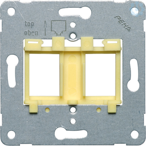 Tragplatte für Schraubbefestigung mit farbigen Einsätzen zur Aufnahme von bis zu 2 Modular-Jack-Steckverbindern mit gelbem Einsatz AMP/tyco 2153000-1, 2153001-1, 1116604-2, 1339015-1, 1375055-1, 1375188-1, 1711716-1, 1711592-1, 1711342-1, 1711160-1, 1711437-1, 1711441-1, 1933284-2 Duplex LC Adapter Daetwyler PS-GG45 400102 cat7A o.S. geschirmt Nexans N420.550,-.551,-.555,-.556 (mit Clip N429.626) N420.660,-.661,-.666,-.667 (mit Clip N429.626) N420.666G,-.667G,-.66A,-.67A (mit Clip N429.626) N420.730,-.731,-.735,-.736 (mit Clip N429.620)