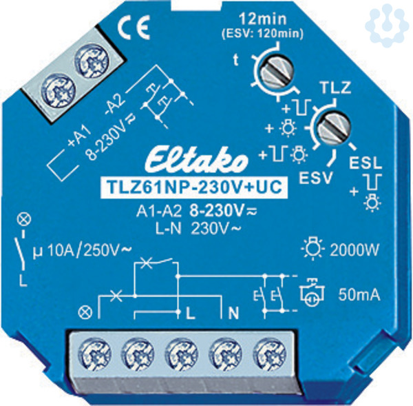 Treppenlicht-Zeitschalter 230V+UC. 1 Schließer nicht potenzialfrei 10A/250V AC, Glühlampen bis 2000W, ESL und LED-Lampen bis 200W, Ausschaltvorwarnung und Taster-Dauerlicht zuschaltbar. Stand-by-Verlust nur 0,7 Watt. Mit ESL-Optimierung. Für Einbaumontage. 45mm lang, 45mm breit, 18mm tief. Kontaktschaltung im Nulldurchgang zur Schonung der Kontakte und Lampen. Insbesondere verlängert dies die Lebensdauer von Energiesparlampen. Durch die Verwendung eines bistabilen Relais gibt es auch im eingeschalteten Zustand keine Spulen-Verlustleistung und keine Erwärmung hierdurch. Nach der Installation die automatische kurze Synchronisation abwarten, bevor der geschaltete Verbraucher an das Netz gelegt wird. Steuer-, Versorgungs- und Schaltspannung 230V. Zusätzlich mit galvanisch getrennter Universal-Steuerspannung 8..230V UC. Zeiteinstellung 1 bis 12 Minuten. Glimmlampenstrom bis 50mA, abhängig von der Zündspannung der Glimmlampen. Für 3- und 4-Leiter-Schaltungen, nachschaltbar, mit Dachbodenbeleuchtung bei 4-Leiter-Sch