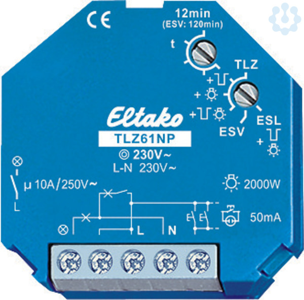 Treppenlicht-Zeitschalter 230V. 1 Schließer nicht potenzialfrei 10A/250V AC, Glühlampen bis 2000W, ESL und LED-Lampen bis 200W, Ausschaltvorwarnung und Taster-Dauerlicht zuschaltbar. Stand-by-Verlust nur 0,7 Watt. Mit ESL-Optimierung.Für Einbaumontage. 45mm lang, 45mm breit, 18mm tief. Kontaktschaltung im Nulldurchgang zur Schonung der Kontakte und Lampen. Insbesondere verlängert dies die Lebensdauer von Energiesparlampen. Durch die Verwendung eines bistabilen Relais gibt es auch im eingeschalteten Zustand keine Spulen-Verlustleistung und keine Erwärmung hierdurch. Nach der Installation die automatische kurze Synchronisation abwarten, bevor der geschaltete Verbraucher an das Netz gelegt wird. Steuer-, Versorgungs- und Schaltspannung 230V. Zeiteinstellung 1 bis 12 Minuten. Glimmlampenstrom bis 50mA, abhängig von der Zündspannung der Glimmlampen. Für 3- und 4-Leiter-Schaltungen, nachschaltbar, mit Dachbodenbeleuchtung bei 4-Leiter-Schaltung. Automatische Erkennung der Schaltungsart. Nach einem Stromausfall wird