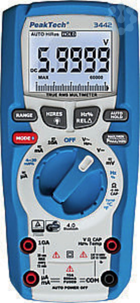 Das neue PeakTech 3442 ist ein praktisches Digital-Multimeter für hohe Beanspruchung mit einer Vielzahl an nützlichen Messfunktionen.Die Messanzeige des Gerätes lässt sich auf Tastendruck zwischen 3 5/6-stelliger LCD auf eine hochauflösende 4 5/6-stellige LCD umschalten, wobei alle Messungen als Echt-Effektivwert erfasst werden. Neben den umfangreichen Messfunktionen für Strom, Spannung, Kapazität, Widerstand und vielem mehr, verfügt diese Neuentwicklung unter anderem über eine 4-20 mA% Stromschleifenmessung, einen Tiefpassfilter und eine Auto-Hold Funktion.-Messwertanzeige max. 59999-Bluetooth 4.0 Schnittstelle-Echt-Effektivwertmessung (TrueRMS)-Durchgangsprüfung und Diodentest-Auto-Hold, Min, Max und AVG Funktion-4-20mA% Stromschleifenmessung-Sicherheit: EN 61010-1 . CAT III 1000 V / CAT IV 600 V. TÜV/GS