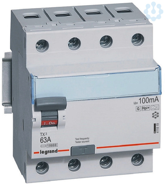 Legrand Fehlerstromschutzschalter TX3, Typ F-G, Mischfrequenzsensitivnach EN 62423, VDE 0664-10, EN 61008-1, G nach ÖVE E8601, kurzzeitverzögert, verzögert mindestens 10 ms, 4-polig, Bemessungsstrom In 63 A, Bemessungsfehlerstrom Idn 100 mA, Bemessungsspannung Un 400 VAC, Bemessungsfrequenz 50 Hz, Stoßstromfest bis 3000 A, Bemessungskurzschlussstrom 10 kA bei geeigneter Vorsicherung, Befestigung auf Hutprofilschiene EN 60715 durch rastende Schnellbefestigungen, klare Information vorne auf jedem Gerät, eindeutige Schaltstellungsanzeige rot/grün am Schalthebel, mit Beschriftungsfenster, mit Untersteckschutz zum sicheren Einführen des Leiters in Fahrstuhlklemme, Anbau von Hilfsgeräten möglich.