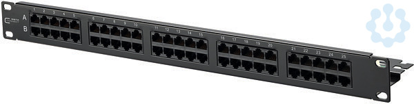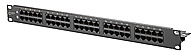 19 Zoll 1HE Cat.3 Patchfeld mit 50 RJ45-Buchsen 8(4), 19 Zoll Modulträger aus Stahlblech, schwarz lackiert, Anschluss der Anschlussleitungen an LSA-PLUS® Schneidklemmen (AWG 22-26), geeignet für Durchmesser von 0,4 bis 0,6 mm, anschließbare Kabeltypen: 10 x 10 DA, 4 x 25 DA, 2 x 50 DA (DA=Doppeladern), Beschaltung nach ISO/IEC 11801/EN 50173-1, die Adernpaare können ohne Aufdrehen der Verseilung bis zur Klemme geführt werden, Zugentlastung mittels Kabelbinder auf rückseitiger Kabelabfangung