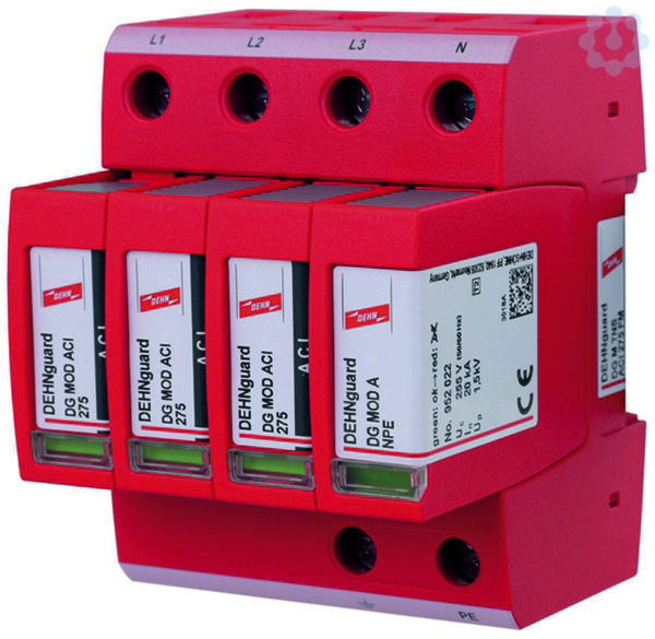 Mehrpoliger Überspannungsableiter DEHNguard M ACI, Typ 2 nach EN 61643-11 mit integrierte ACI-Schalter-/Funkenstrecken - Kombination, bestehend aus Basisteil und gesteckten Schutzmodulen. Hohe Gerätesicherheit durch Ableiterüberwachung mit Thermo-Dynamik-Control. Zum Schutz von Niederspannungs-Verbraucheranlagen vor Überspannungen. Zum Einsatz im Blitz-Schutzzonen-Konzept an den Schnittstellen 0B ? 1 und höher.