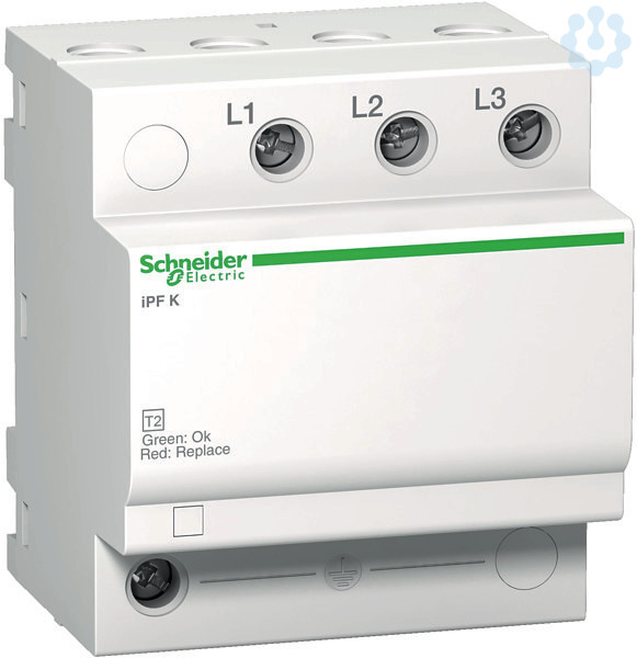 Überspannungsableiter iPF K 40. 3-polig. Imax 40kA, In 15kA, Netzform TN-C, Überspannungsschutzpegel kV: ?1,5, Betriebsspannung 400 V AC ±10 %. Breite 4 TE. Frontseitige farbliche Fehlermeldeanzeige, Grün nicht ausgelöst, Rot ausgelöst. Norm IEC 61643-11: 2011 T2.