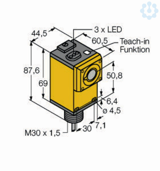 Ultraschallsensor, Reflexionstaster, Blindzone: 10 cm, Reichweite: 140 cm, Messbereich durch Teachtaster oder Steuerleitung einstellbar, Ansprechzeit einstellbar, Öffnungswinkel der Schallkeule 15°, Leitungslänge 2 m, Analogausgang wahlweise für Strom oder Spannung, Teach?in?Funktion, Ausgangskennlinie konvertierbar, max. Reichweite: 1400 mm