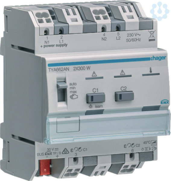 Universal-Dimmaktor 2-fach KNX, 2x300W, ESL/LED, kombinierbar. Universal-Dimmaktor zum Schalten/Dimmen und zur automatischen Erkennung der Lastart (Autodetect-Verfahren) und zur Optimierung des Dimmbereichs (Easydetect-Verfahren) mittels Tastendruckmodus am externen Sensor, am Gerät oder über ein Objekt. Profimodus zur Auswahl der Modis am Gerät oder per Buszugang. Zum Dimmen von dimmbaren LED und Energiesparlampen, Glühlampen, Hochvolt Halogenlampen und Niedervolt Halogenlampen mit konventionellem oder elektronischem Transformator. Das Gerät setzt die Businformationen in entsprechende Befehle um. Funktionen: Dimmen, Schalten, Zwang, Zeit, Ausschaltvorwarnung, Szenenabruf (64 pro Kanal, jeweils mit eigener Anfahrzeit). Jeder Dimmausgang hat am Gerät eine Handbedienung, die auch sperrbar ist, und eine Schaltzustandsanzeige per LED. Die Dimmkanäle können in verschiedenen Kombinationen zur Leistungserhöhung zusammengeschaltet werden. Mit Schutz gegen Überhitzung, Überlast und Kurzschluss. Beschriftungsmöglichkei