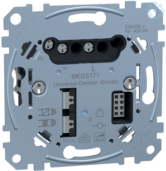 Für ohmsche, induktive oder kapazitive Lasten, z. B. Glühlampen, dimmbare LED-Lampen, dimmbare gewickelte Trafos oder dimmbare elektronische Trafos. (Phasenanschnitt oder Phasenabschnitt). Der Universaldimmer erkennt automatisch die angeschlossene Last. Keine Mischlasten anschließen. Mit Krallen- und Schraubbefestigung. Mit Schraubklemmen. Funktionen: -Schalten und Dimmen von einem Ausgang. Es wird durch das Modul die Art und Weise festgelegt, wie die Funktion des Einsatzes genutzt wird. Externe Ansteuerung über einen PlusLink Eingang. Überlast- und kurzschlussfest. Softstart. Memory-Funktion. Nennspannung: AC 220/230 V, 50/60 Hz. Anschlussquerschnitt: max. 2x2,5 mm². Absicherung: 16 A-Leitungsschutzschalter. Neutralleiter: nicht erforderlich. Schaltleistung mit Taster-Modul Basic und Comfort: LED Lampen: 7-210 W (Phasenabschnitt). 7-50 W (Phasenanschnitt). Glühlampen: 10-420 W. Halogenlampen: 10-420 W (230 V). 30-420 VA (NV mit dimmbarem gewickeltem Trafo). 10-420 VA (NV mit dimmbarem elektronischem Trafo).