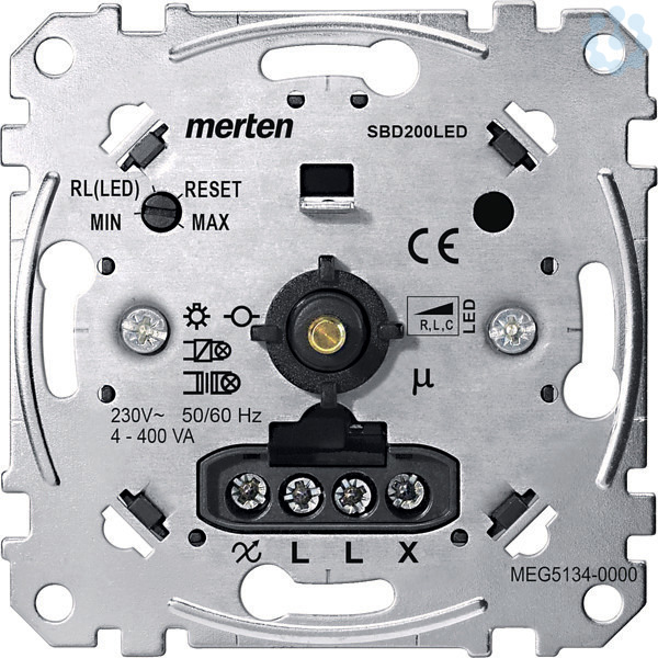 Für ohmsche, induktive oder kapazitive Lasten, z. B. dimmbare LED-Lampen, Glühlampen, dimmbare gewickelte Trafos oder elektronische Trafos. (Phasenanschnitt oder Phasenabschnitt). Der Universal-Dimmer erkennt automatisch die angeschlossene Last. Keine Mischlasten anschließen. Mit Druck-Wechselschalter. Mit Krallen- und Schraubbefestigung. Mit Schraubklemmen. Nennspannung: AC 230V AC, 50 Hz. Schaltleistung: LED Lampen: 4-200 VA (RC-Modus). 4-40 VA (RL-LED-Modus). Glühlampen: 4-400 W. Halogenlampen: 4-400 W (230 V). 4-400 VA (NV mit dimmbarem gewickeltem Trafo). 4-400 VA (NV mit dimmbarem elektronischem Trafo). Neutralleiter: nicht erforderlich. Anschlussklemmen: Schraubklemmen für max. 2,5 mm². Absicherung: 16 A-Leitungsschutzschalter. Eigenschaften: -kurzschlussfest. überlastfest. überhitzungsfest. Softstart. automatische Lasterkennung. Min. / Max. Begrenzung einstellbar. Betriebsart RL-LED-Modus einstellbar. Zu komplettieren mit: Zentralplatte mit Drehknopf System M MEG5250-03xx/-04xx/-06xx Zentralplatte mit