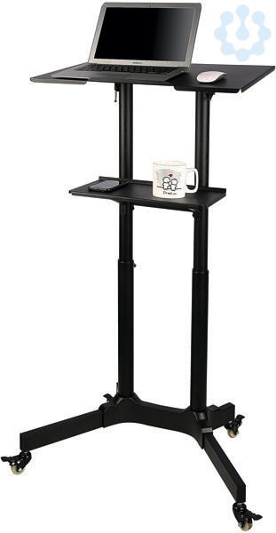 Arbeitsstation Ideal als Rednerpult, Podest, Notebookständer oder Laptoparbeitsplatz geeignet. Es bietet somit ein kompaktes, platzsparendes Gestell. Die Höhe der des Trolleys lässt sich leicht von 1030 bis 1250 mm einstellen. Das obere Regal (Abmessungen von: 600 x 400 mm) kann zur besseren Ergonomie leicht von 0 bis 40 ° gekippt werden. Bietet eine praktische Zusatzablage für Tastaturen oder andere kleine Gegenstände (Größe 400 x 213 mm). Ausgestattet mit vier robusten Rädern - Somit lässt sich das Gestell einfach und überall hin mitnehmen Kompakte Basis mit flachen Hinterfüßen für die Aufbewahrung des Gestells in Wandnähe Technische Daten Robuster Metallrahmen Hauptregal Größe: 600 x 400 mm Verstellbare obere Plattform von 0 ° bis 40 ° Sekundärregal: 400 x 213 mm Einstellbare Höhe: 1030 bis 1250 mm Ausgestattet mit 4 Rollen mit Bremse Bodengröße: 620 x 392 mm Packungsinhalt Verstellbare Workstation mit Rädern, Schwarz Benutzerhandbuch