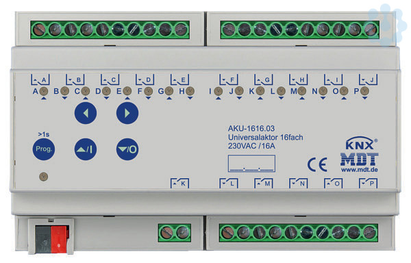 Universalaktor 16-fach, 8TE, REG, 16A, 230VAC, 100µF, 15EVG. Kompakte Ausführung mit bistabilen Relais Strom max. 16A bei ohmscher Last, 100µF/15EVG. Mit Sonnenstandsberechnung / Beschattung. Kann als Schaltaktor (max. 16-fach) oder Jalousieaktor (max. 8-fach) eingesetzt werden. Beliebige Mischformen aus Schalt- und Jalousieaktor. Heizungsansteuerung mit PWM 0-100%. Taster für Handbetrieb und LED Anzeige je Kanal. Praxisnahe Lüftungsfunktion (Fenster geöffnet/gekippt). Automatische Beschattung/Lamellennachführung mit Sonnenstandsberechnung. Zeitfunktionen (Ein-/Ausschaltverzögerung, Treppenlichtfunktion). Rückmeldefunktion (aktiv/passiv) für alle Kanäle. Logische Verknüpfungen, 8 Szenen je Kanal. Zentralfunktionen und Sperrobjekte zur Zwangsführung. Betriebsart Jalousie/Rolllade einstellbar. Lauf-, Pausen- und Schrittzeit frei einstellbar. Einstellbares Verhalten bei Busspannungsausfall/-wiederkehr. 4mm² / 2x2,5mm² Anschlußklemmen. Alle L-Anschlüsse getrennt. 3 Jahre Produktgarantie.
