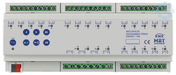 Universalaktor 24-fach, 12TE, REG, 16A, 230VAC, 100µF, 15EVG. Kompakte Ausführung mit bistabilen Relais Strom max. 16A bei ohmscher Last, 100µF/15EVG. Mit Sonnenstandsberechnung / Beschattung. Kann als Schaltaktor (max. 24-fach) oder Jalousieaktor (max. 12-fach) eingesetzt werden. Beliebige Mischformen aus Schalt- und Jalousieaktor. Heizungsansteuerung mit PWM 0-100%. Taster für Handbetrieb und LED Anzeige je Kanal. Praxisnahe Lüftungsfunktion (Fenster geöffnet/gekippt). Automatische Beschattung/Lamellennachführung mit Sonnenstandsberechnung. Zeitfunktionen (Ein-/Ausschaltverzögerung, Treppenlichtfunktion). Rückmeldefunktion (aktiv/passiv) für alle Kanäle. Logische Verknüpfungen, 8 Szenen je Kanal. Zentralfunktionen und Sperrobjekte zur Zwangsführung. Betriebsart Jalousie/Rolllade einstellbar. Lauf-, Pausen- und Schrittzeit frei einstellbar. Einstellbares Verhalten bei Busspannungsausfall/-wiederkehr. 4mm² / 2x2,5mm² Anschlußklemmen. Alle L-Anschlüsse getrennt. 3 Jahre Produktgarantie.