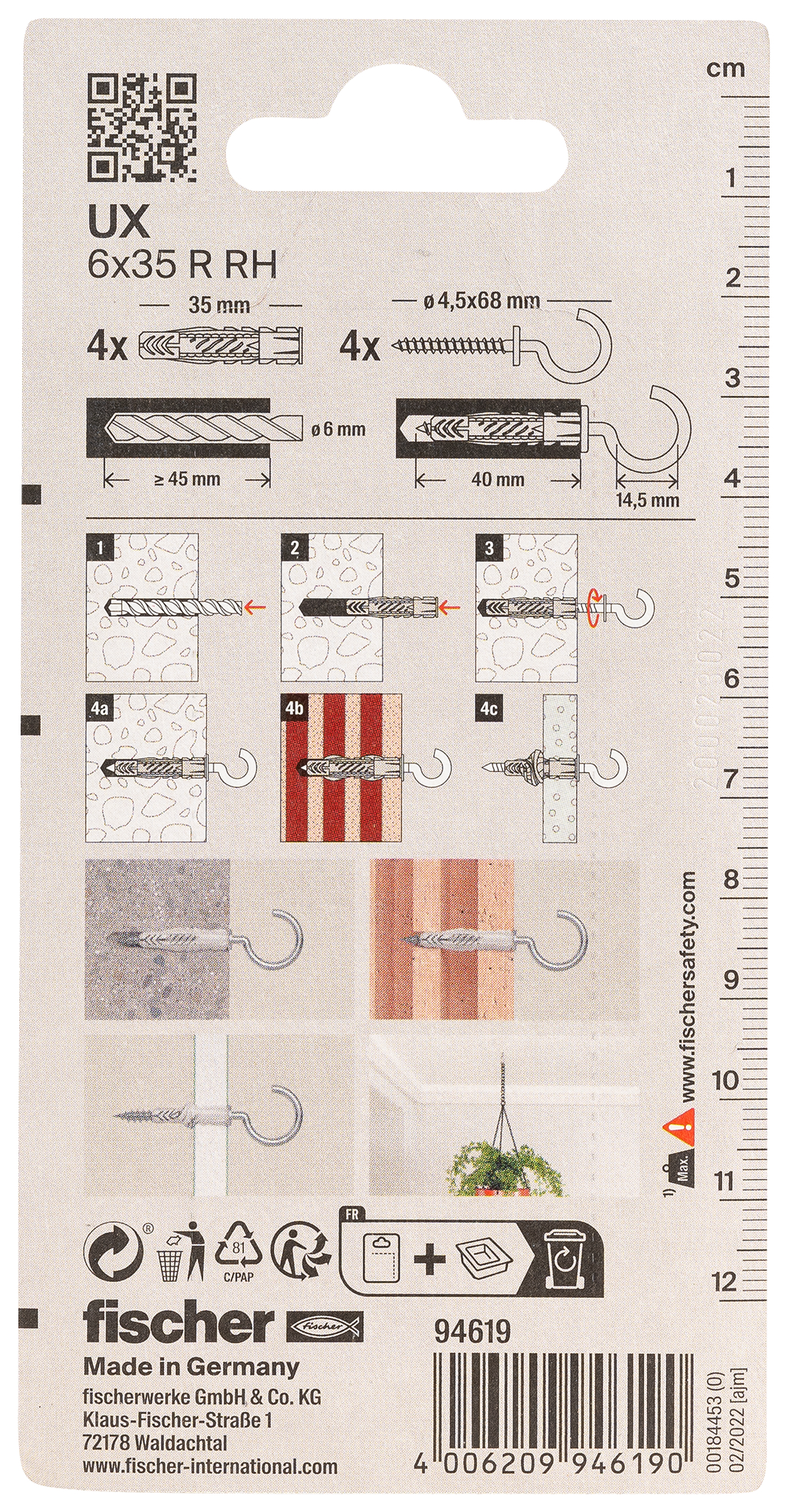 Der fischer Universaldübel ist der Allrounder aus hochwertigem Nylon. Der Dübel hält in Beton, aber auch in Porenbeton, im Mauerwerk und in Gipskarton- und Gipsfaserplatten. In diesen Baustoffen verknotet der Dübel. Praktisch ist der angeformte Rand. Damit rutscht der Dübel beim Einstecken nicht ins Bohrloch. In der Verpackung sind bereits weiße, nylonbeschichtete Winkelhaken mit dabei. Das spart die Sucherei und garantiert, dass diese auch optimal zum Dübel passen. Mit dem fischer Universaldübel UX mit Winkelhaken können beispielsweise Bilder, Bords und Hängeschränke befestigt werden.