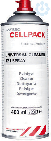 Reinigungsspray zur Reinigung von Maschinenteilen und Werkstoffoberflächen. Anwendungsgebiete: Abwaschen von Leitschichten, löst halbleitende Rückstände (z. B. Graphitschichten), reinigen und entfetten von Motoren und elektrischer Ausrüstung, reinigen von Kabeln und Leitungen. Eigenschaften: Verwendbar auf Neopren, Polyethylen, EPR, XLPE, PVC, Butyl-Gummi und thermoplastischen Isolationen, kein Freisprühen des Sprühkopfes erforderlich, reinigt und entfettet ohne zu leiten und ohne Rückstände, sicher, schnell wirkend, keine Zersetzung. Lieferumfang: Reinigungsspray UNIVERSAL CLEANER 121.