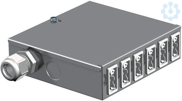Energieverteiler für Starkstromtechnik mit Festanschluss, bestückt und vorverdrahtet. Eingang: 1 Drehstromkreis über einen schraubenlosen Steckklemmblock 5-polig für Leitungsquerschnitte 0,5 - 4 mm². Ausgang: 6 selbstverriegelnde Steckverbinder 3-polig in weiß, 16 A, Typ GST18i (Buchse: 2 x L1, 2 x L2, 2 x L3). Verdrahtung intern: PVC-Aderleitung H07V-U2,5.
