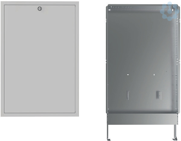 Montage- und Installationsschrank für die Unterputzmontage zum einfachen, variablen und sicheren Einbau der verschiedenen Module für die Trinkwasserbereitung und allen Hydraulikmodulen für den Anschluss bis zu 9 Heizkreisen, inkl. elektrischer Anschlusskomponenten. Bestehend aus Einbauzarge und Frontblende Feuerverzinktes Stahlblech, alle sichtbaren Teile in weiß RAL 9016 Schrankfüße bis 160 mm ausziehbar für 2 bis 9 Heizkreise vorbereitete Aufnahmepunkte für Trinkwassermodul, Kugelhahnschiene, Verteiler- und Hydraulikmodulen, Elektrokomponenten vorgefertigte Halterungspunkte für Einbau in Trockenbauwänden Schrankmaße Einbauzarge B x H x T: 724 x 1180-1340 x 110 mm komplett mit Frontblende B x H x T: 748 x 1195-1355 x 122-162 mm