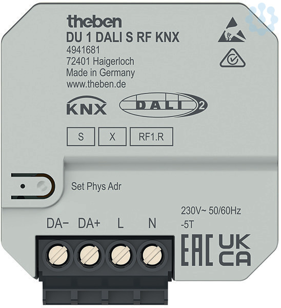 UP 1-fach Funk-DALI-Aktor, KNX RF, Data Secure, DALI-2-zertifiziert, Schnittstelle zwischen dem DALI- und dem KNX Bus-System, Einfache Inbetriebnahme von bis zu 30 EVGs im Broadcast Betrieb, Steuerung von RGB, RGBW, Tunable White oder herkömmlichen Leuchten, Unterstützung von DT-8 Leuchten, Einfaches Ersetzen von EVGs im Fehlerfall, Universelle Montage durch besonders kompaktes Gehäuse, 2 Binäreingänge für potentialfreie Kontakte wie Taster, Schalter, Fensterkontakte, Temperatursensor (Eingang I2), Der Binäreingang I1 ist ab Werk dem Ausgang zugewiesen (Funktionstest und Betrieb auch ohne Programmierung), Integrierte Temperaturüberwachung für erhöhte Betriebssicherheit z.B. bei Überlast, Sichere Kommunikation durch Unterstützung von KNX Data Secure