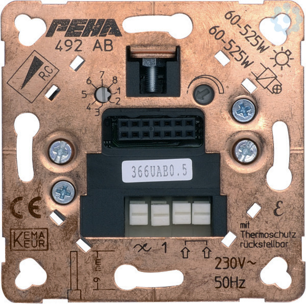 Unterputz-Dimm-und-Schalt-Einsatz FET-Einsatz für elektronische NV-Trafos und ohmsche Lasten, passend für folgende Oberteile: Tastaufsatz D xx.420.xx, Serientastaufsatz D xx.425.xx JR, Bewegungsmelder-Oberteil 180° D xx.410.xx BM (bei 2-Leiter-Anschluss an elektronische Trafos, bei Parallelbetrieb von max. 3 Bewegungsmeldern), mit 8 Funktionen wie Artikel-Nr. D 492 AN o.A. Technische Daten: Phasenabschnittdimmer Lastkennzeichnung R, C, Versorgungsspannung 230 V~, 50 Hz, 2-Leiter-Anschluss, Schutzklasse IP 20, Nebenstelleneingang für unbeleuchtete Taster, getasteter L. Schaltleistung: Glühlampen 230 V~ 60-525 W elektronischeTrafos 60-525 VA