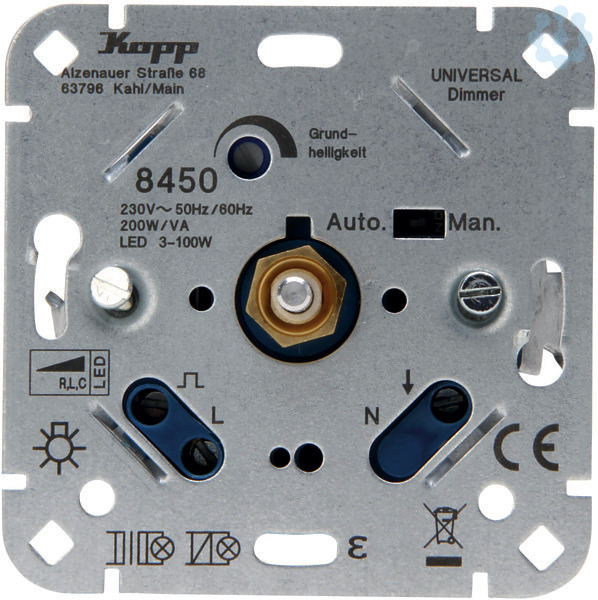 Universaldimmer - Sockel, für alle Kopp Fachhandel UnterputzSchalterprogramme, passend auch für viele Programme vom Wettbewerb.Erkennung des geeigneten Dimmverfahrens (Phasenan-oder Phasenabschnitt),durch mech. Umschalter ist das entgegengesetzte Verfahre